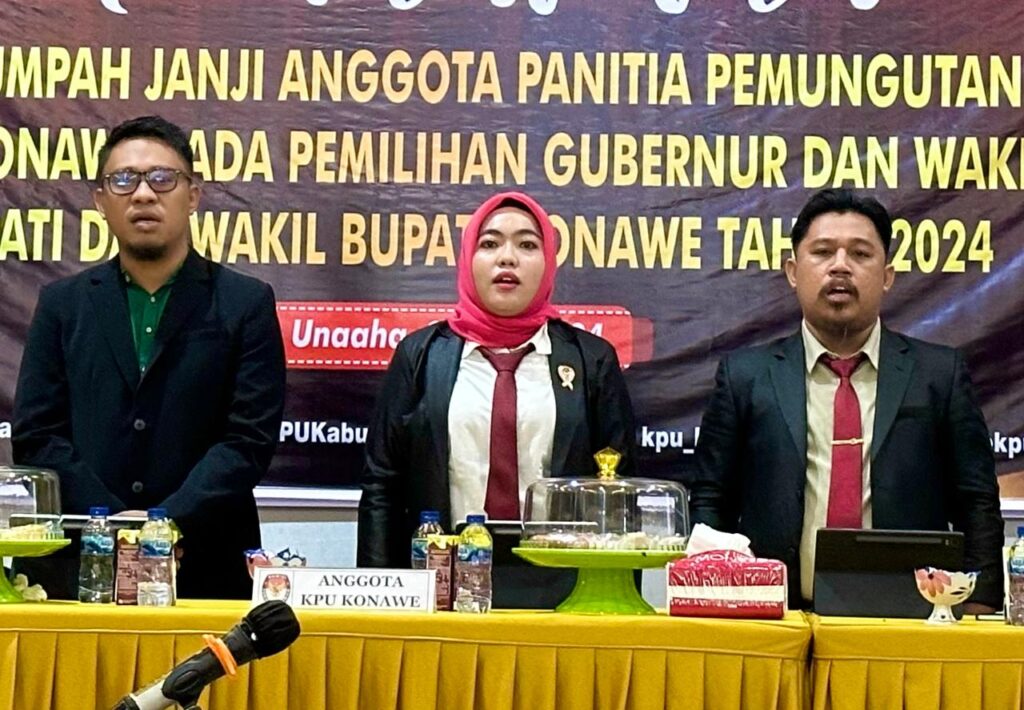 OKEKABAR.COM, KONAWE – Ketua KPU Konawe melantik 1044 Panitia Pemungutan Suara (PPS) untuk pemilihan kepala daerah (Pilkada) serentak tahun 2024 di salah satu Hotel di Kecamatan Unaaha, Minggu (26/5/2024).